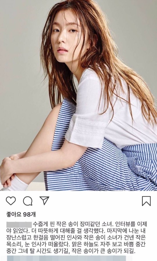 a씨는 4년 전 "수줍게 핀 작은 송이 장미같던 소녀. 인터뷰를 이제야 읽었다. 더 따듯하게 대해줄 걸 생각했다"며 아이린과 함께 작업한 화보 촬영 후기를 전했습니다. 이어 "마지막에 나눈 내 장난스럽고 한걸음 떨어진 인사와 작은 송이 소녀가 건네 작은 목소리, 눈 인사가 떠올랐다"고 글을 올렸습니다.