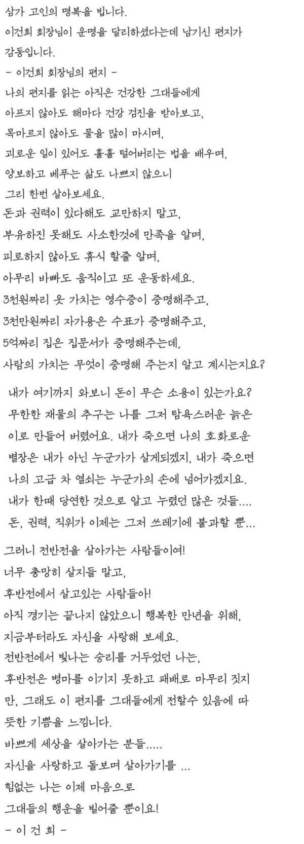 26일 온라인에는 ‘이건희 회장이 남긴 마지막 편지’라는 제목을 단 글이 광범위하게 유포됐습니다. 해당 글은 “아프지 않아도 해마다 건강 검진을 받아보고, 목마르지 않아도 물을 마시며, 괴로운 일이 있어도 훌훌 털어버리는 법을 배우며, 양보하고 베푸는 삶도 나쁘지 않으니 그리 한 번 살아보라”는 말로 시작됩니다.