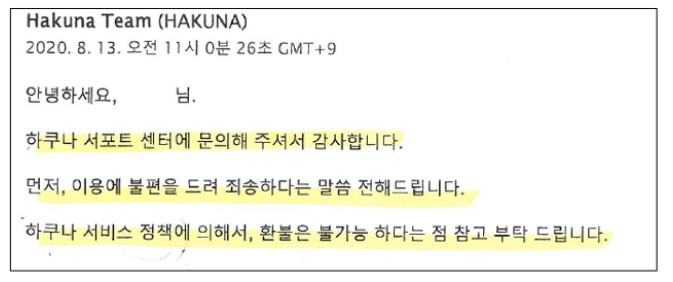 b씨는 "하쿠나는 이메일만 있어서 수십여 차례 이메일로 사정을 이야기했다. 하쿠나와 직접 상담은 못 했고, bj들의 전화번호와 만날 수 있는 자리라도 마련해 달라고 요청을 해서 9월 15일 줌미팅을 통해서 처음 목소리를 듣게 됐다"고 밝혔습니다.