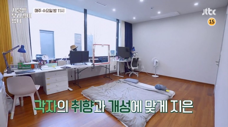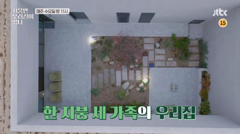 같은 구조지만 세 가족의 각기 다른 취향이 담겨있었습니다. 여동생 부부의 집은 민트색으로 포인트로 스튜디오 느낌을 낸 언니 집과는 달리 베이지색으로 따뜻한 분위기를 연출했습니다. 남편의 대학 동기의 집은 다른 두 집과 달리 중정 바닥을 콘크리트로만 깔아 흙을 싫어하는 집주인의 취향을 반영했습니다.