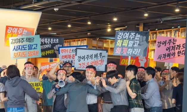 그러나 그런 여주의 기분을 망치는 사건이 발생한다. 시위대가 북토크 현장을 습격했습니다. 시위대는 피켓을 들고 소란을 피웠습니다. 달걀 투척도 서슴지 않는 모습이 위기일발의 느낌을 주었습니다.