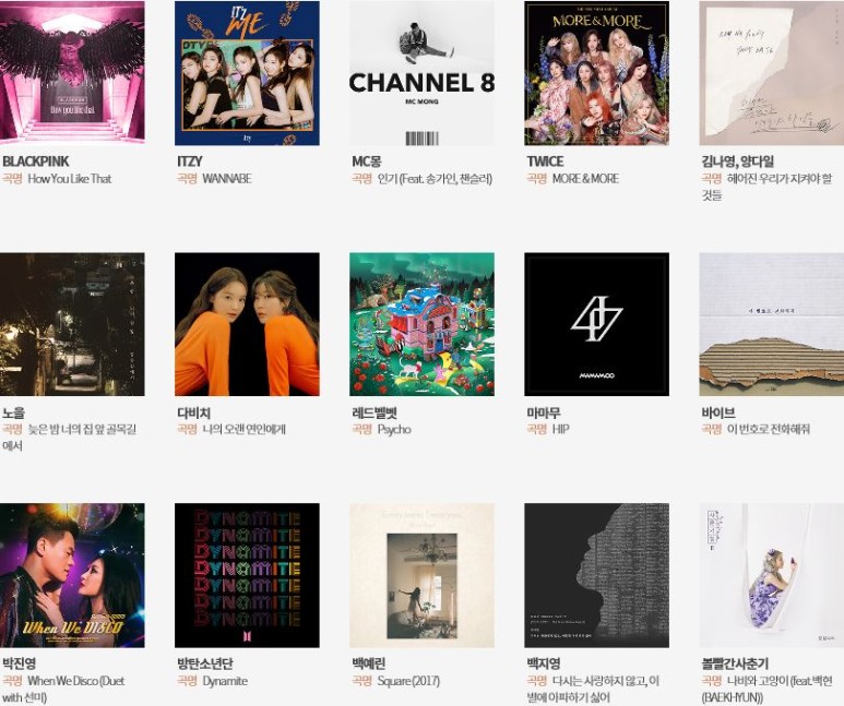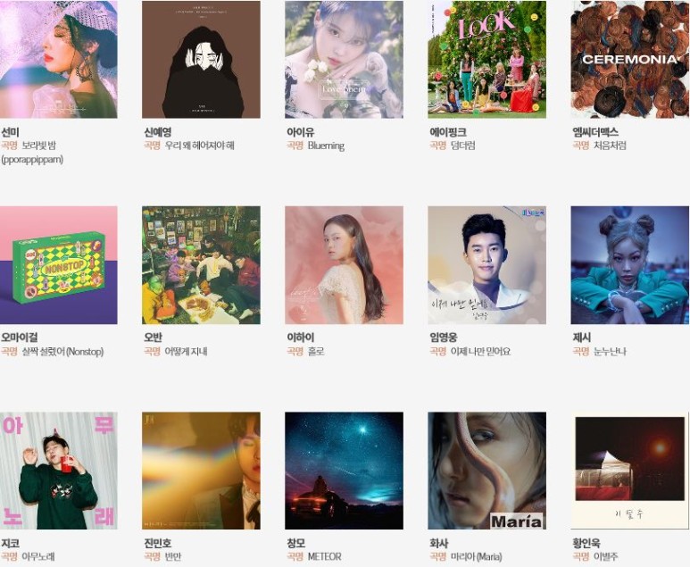 블랙핑크, 있지, MC몽, 트와이스, 감나영 양다일, 노을, 다비치, 레드벨벳, 마마무, 바이브, 박진영, 방탄소년단. 백예린, 백지영, 볼빨간사춘기, 선미, 신예영, 아이유, 에이핑크, 엠씨더맥스, 오마이걸, 오반, 이하이, 임영웅, 제시, 지코, 진민호, 창모, 화사, 황인욱 등