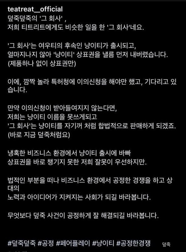 특히 포항 덮죽집 사장님은 인스타를 통해 억울한 심정을 전해 안타까움을 전했습니다. 결국 덮죽덮죽의 이상준 대표는 12일 새벽 "이번 본사의 덮죽 프랜차이즈 진행과정에 있어 '메뉴명 표절' 및 '방송관련성 오인할 수 있는 문구'를 표기했다", "수개월의 연구와 노력을 통해 덮죽을 개발하신 포항의 신촌s 덮죽 대표님께 너무 큰 상처를 드렸다"고 사과의 뜻을 전했습니다. (이미 따라할거 다 따라하고 걸리니깐 사과하네요. 이리 뻔뻔할수가..)