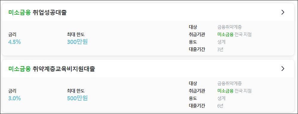 취업성공대출 금리 4.5% 최대한도 300만 원 3년 상환, 취약계층 교육비 지원 대출은 3.0% 금리에 최대 500만 원까지 대출이 되고 6년 상환입니다.