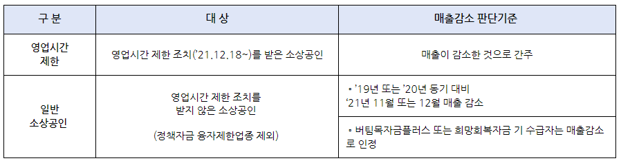 * 영업시간 제한 : 2021년 12월 18일 이후 영업시간 제한조치를 받은 소상공인 및 소기업