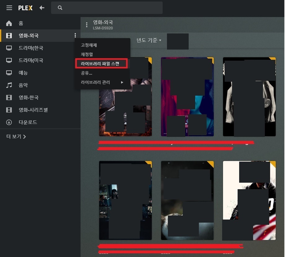 2번째 사진참고해서 - 영화 -외국 항목에서 우클릭 - 라이브러리 파일 스캔하기 자동으로 스캔됩니다.