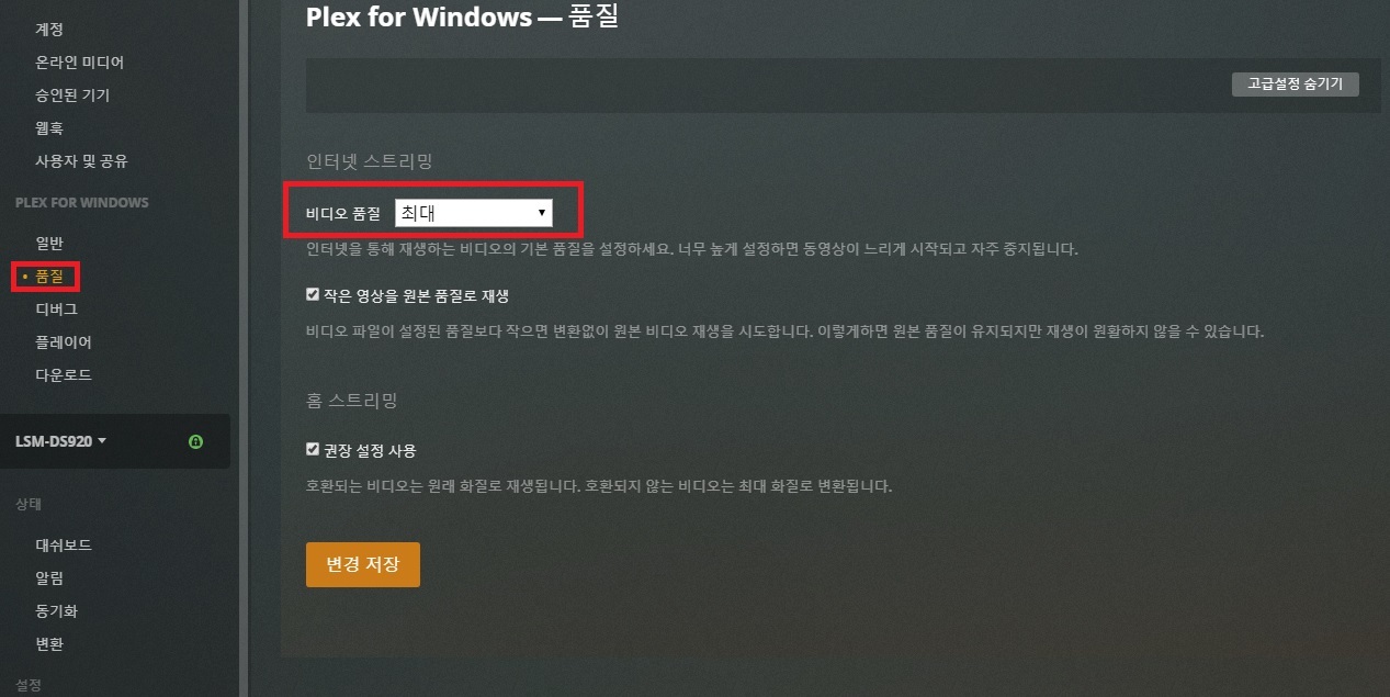 3. NAS PLEX 세팅 - 설정 - WINDOW- 품질 항목
