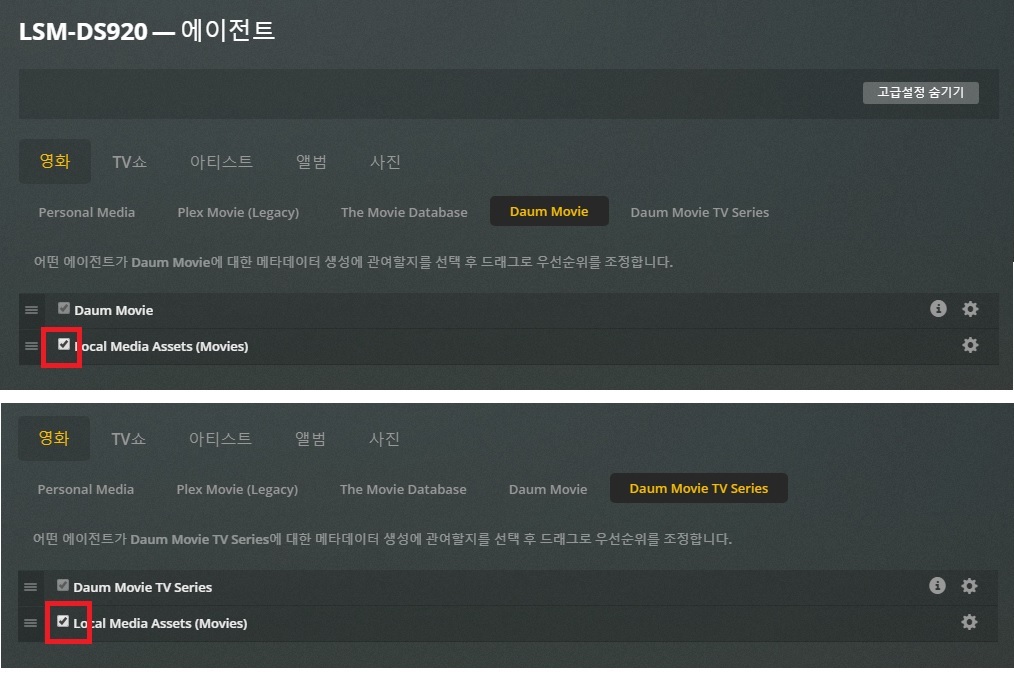NAS 세팅 설정 - 에이전트 설정값으로. 처음 설치한 사람으로는 DAUM Movie, movice TV Series