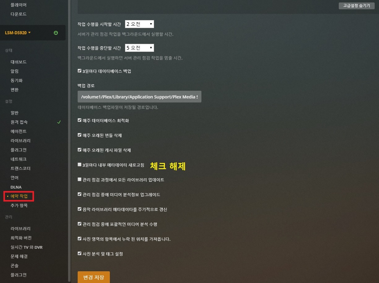 14. NAS PLEX 세팅 - 설정 - 예약작업 항목