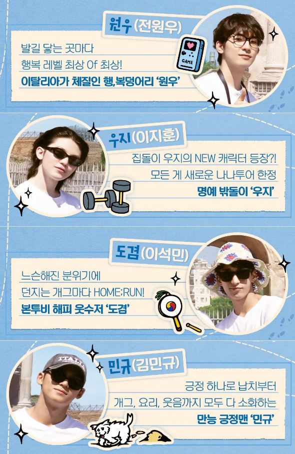 부상 재활 치료로 인해 함께 가지 못하는 에스쿱스가 1회에서 꽤 긴 분량으로 등장했으며, 이후에도 매 회마다 영상통화, 제작진과의 인터뷰를 통해 간간히 등장중이다. 반쯤 농담으로 어떻게든 쿱스를 넣어서 회당 출연료를 챙겨주려고 한다는 얘기도 잠깐 나왔다.