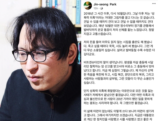 지난 14일 박진성 시인은 자신의 페이스북에 "2016년 그 사건 이후, 다시 10월입니다.. 그날 이후 저는 '성폭력 의혹'이라는 거대한 그림자를 끌고 다니는 것 같습니다"라고 시작하는 글을 게재했습니다.