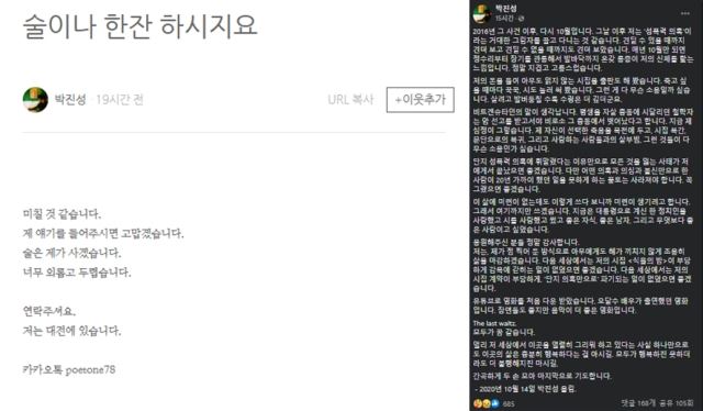 또한 앞서 박진성은 자신의 블로그에 "미칠 것 같습니다. 제 얘기를 들어주시면 고맙겠습니다. 술은 제가 사겠습니다. 너무 외롭고 두렵습니다"라 심경을 드러냈습니다. 해당 글을 접한 조국 전 장관은 "박진성 시인 아는 분이 신속하게 연락하시면 좋겠다"고 우려를 나타했습니다.