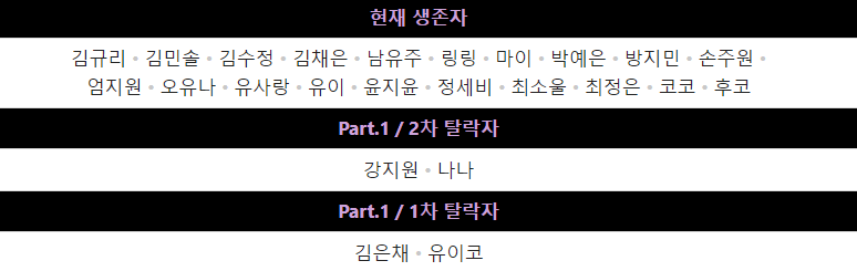 캡틴, 걸스플래닛999, 방과후 설렘, 알유넥스트, 프로듀스101 재팬 시즌3, 스트릿댄스 걸스 파이터 2 등 국내외 오디션 프로그램 출신 연습생들이 몇몇 참가하였다.